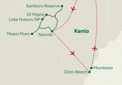 Beginnen Sie Ihre Reise in Nairobi, entdecken Sie die beeindruckende Tierwelt im Samburu Game Reserve und tauchen Sie in die Kultur eines traditionellen Masai-Dorfes ein. Geniessen Sie die Schönheit des Lake Nakuru Nationalparks und bestaunen Sie die majestätische Tierwelt der Masai Mara. Lassen Sie Ihre Reise mit entspannenden Tagen am traumhaften Strand von Diani Beach ausklingen.